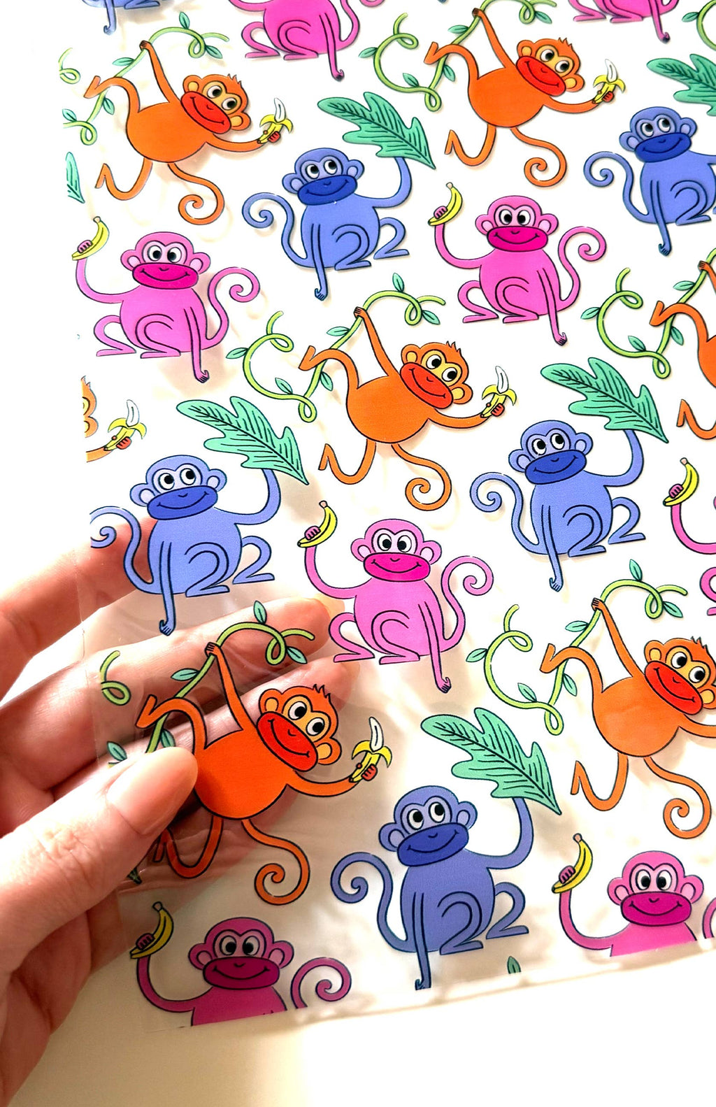 The Monkeying Around clear vinyl features an adorable assortment of monkeys drawn by Shayla Wolf. These cute monkeys are orange, periwinkle and violet - swinging around in some vines and snacking on bananas.