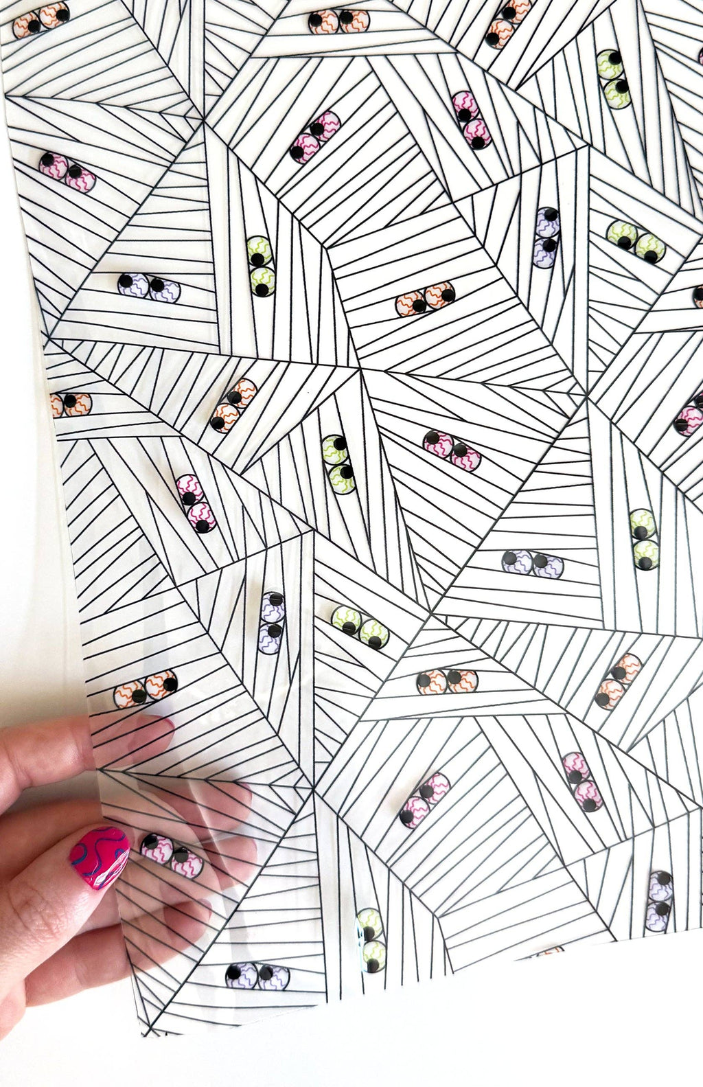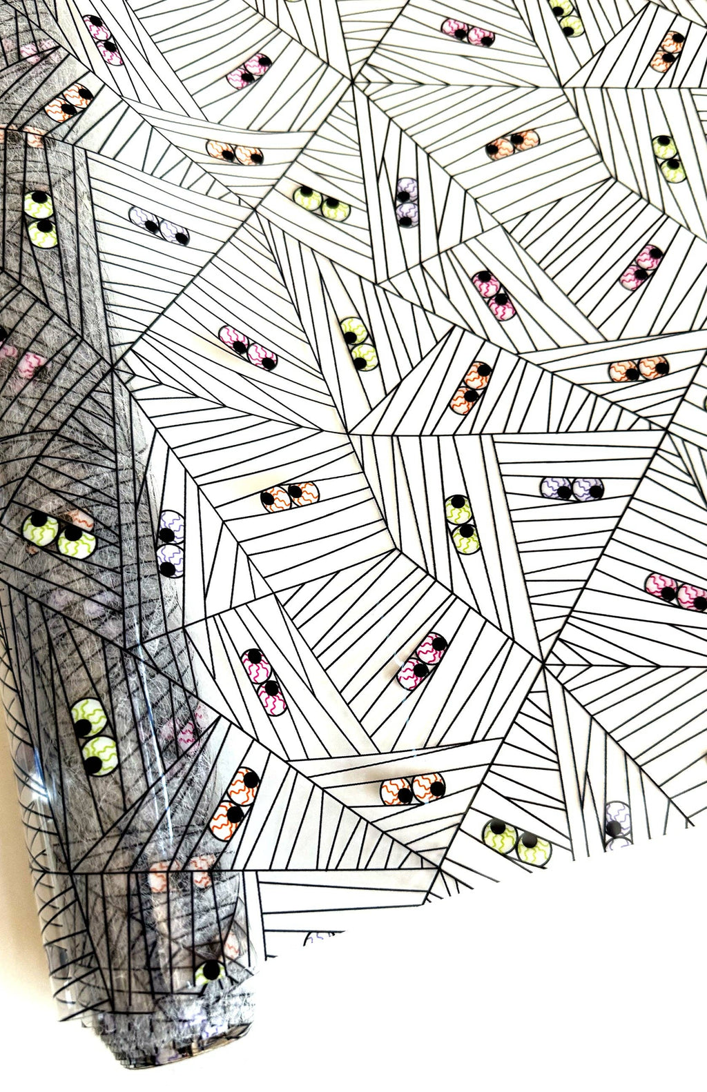 The “Mummy Eyes” clear vinyl features black zentangle styled lines with eyeballs popping in every so often. The lines and eyeballs create a fun mummy print designed by Shayla Wolf.