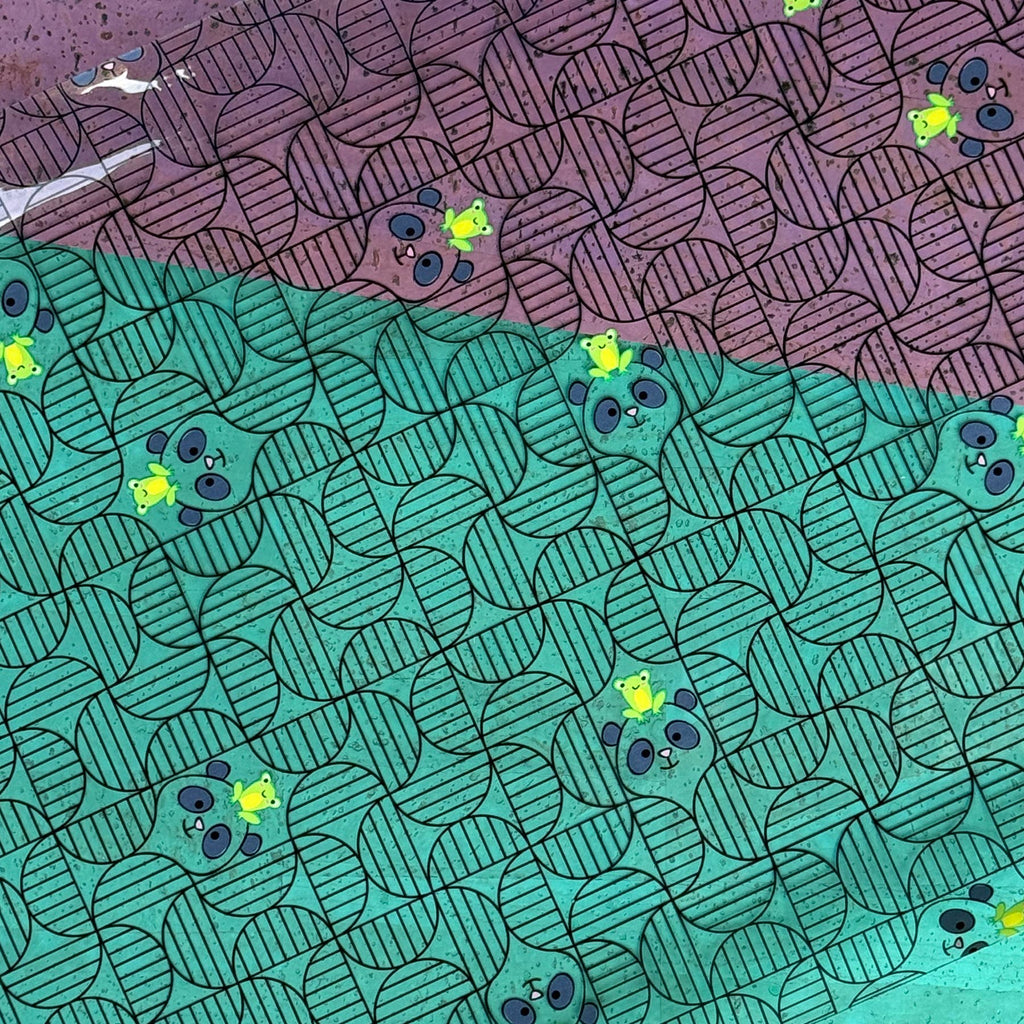 The Panda + Frog clear vinyl features a black line design featuring panda faces and little frogs sprinkled in. This cute print drawn by Shayla Wolf combines quilty designs with cute critters, perfect for any project!