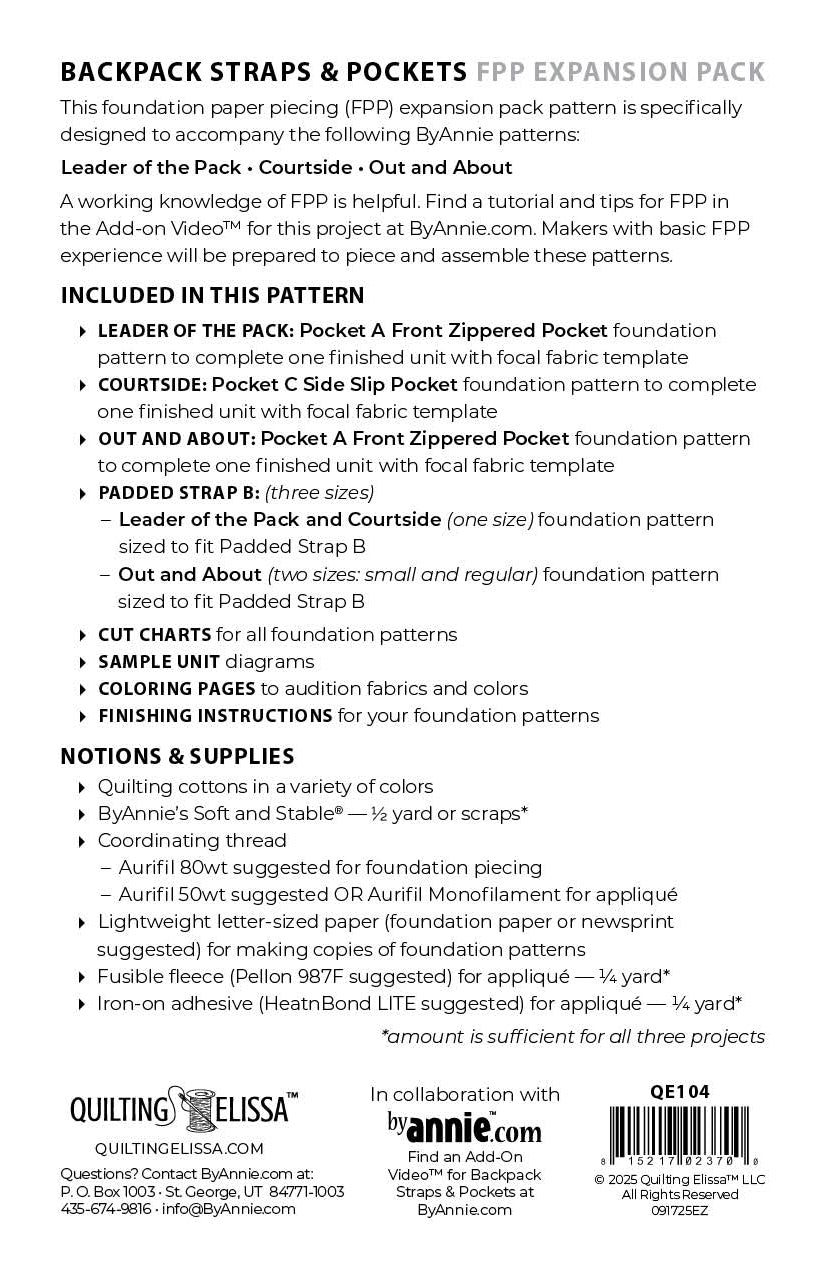 Quilting Elissa created this FPP (foundation paper piecing) Expansion Pack specifically to customize Backpack Straps and Pockets on three ByAnnie patterns (Leader of the Pack, Courtside, and Out and About).